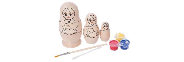 - Набор матрёшек для раскрашивания — классическая игрушка, которую можно превратить в авторскую работу. Возможно, это даже поможет раскрыть талант юного художника!